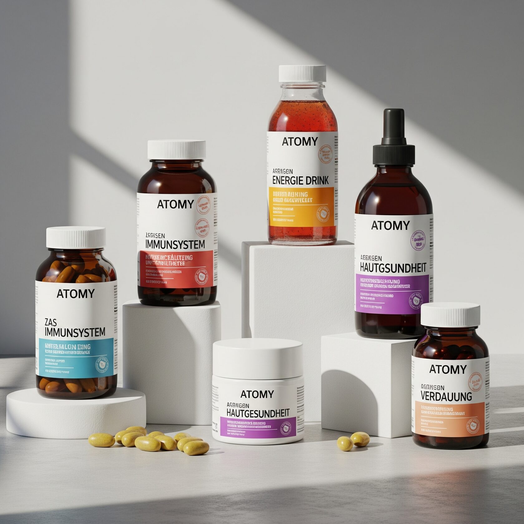 Atomy bietet eine breite Palette an Nahrungsergänzungsmitteln an, die auf die individuellen Bedürfnisse der Verbraucher abgestimmt sind. Diese Produkte decken verschiedene Aspekte der Gesundheit ab, darunter: